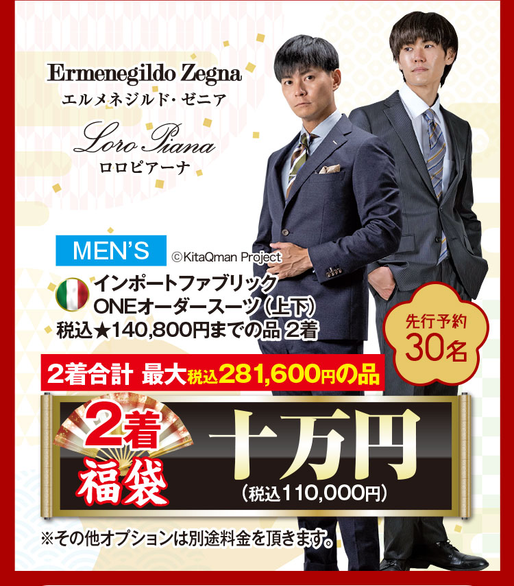【サンセルコ店限定】新年祭 開催期間 2025年12月27日(土)~12月31日(水) 対象店舗 福岡サンセルコ店(予約限定) キャンペーン内容 ■オーダースーツ半額 ■インポートファブリック福袋2着7万円 ■インポートファブリック福袋2着10万円