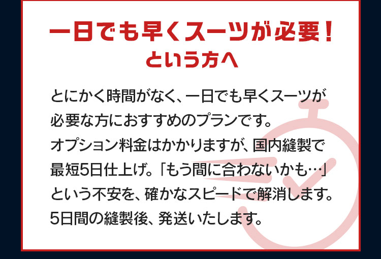 とにかく時間が無く、一日でも早くスーツが必要な方におすすめのプランです。
