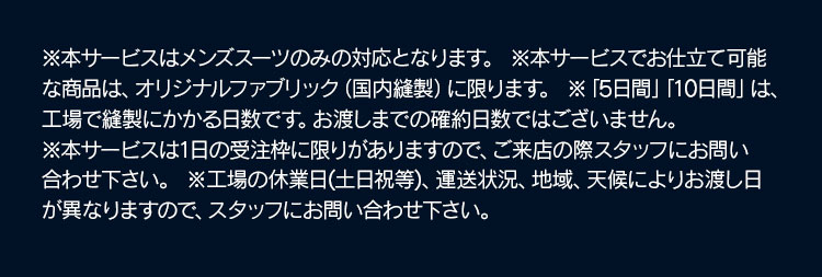 ※本サービスはメンズスーツのみの対応となります。 ※本サービスでお仕立て可能な商品は、オリジナルファブリック(国内縫製)に限ります。 ※「5日間」「10日間」は、工場で縫製にかかる日数です。お渡しまでの確約日数ではございません。 ※本サービスは一日の受注枠に限りがありますので、ご来店の際スタッフにお問い合わせください。 ※工場の休業日(土日祝等)、運送状況、地域、天候によりお渡し日が異なりますので、スタッフにお問い合わせください。