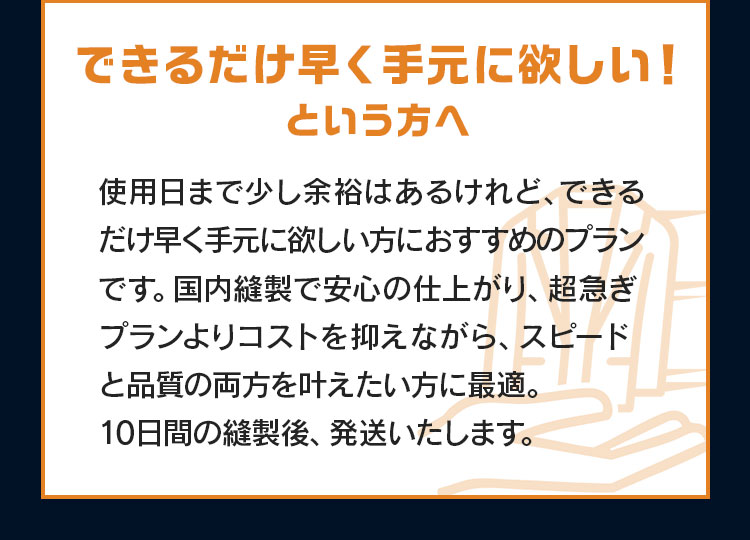 国内縫製で安心の仕上がり、超急ぎプランよりコストを抑えながら、スピードと品質の両方を叶えたい方に最適。10日間の縫製後、発送いたします。