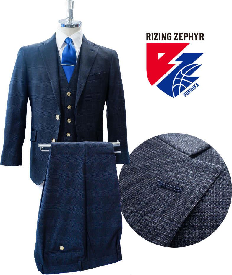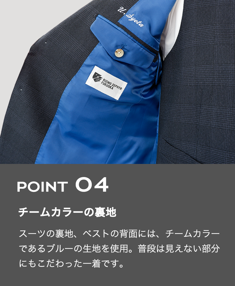 今シーズンのオフィシャルスーツは、ダークネイビーのグレンチェック柄を採用。落ち着きのある上質な生地が、品格と知的さを演出します。裏地にはチームカラーであるブルーを使用し、ネクタイもシンプルなブルーで統一。剣先にはチームロゴをあしらい、洗練されたデザインの中にライジングゼファーフクオカらしいこだわりが詰まっています。ビジネスシーンでも活躍できる上質なデザインで、ブースターの皆様も日常から“ライジング”を感じていただけます。
